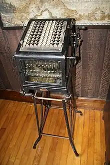 The adding machine range began with the basic, hand-cranked Class 1 which was only capable of adding.[2] The design included some revolutionary features, foremost of which was the dashpot which governed the speed at which the operating lever could be pulled so allowing the mechanism to operate consistently correctly.[3] The machine also had a full-keyboard with a separate column of keys 1 to 9 for each decade where the keys latch when pressed, with interlocking which prevented more than one key in any decade from being latched. The latching allowed the operator to quickly check that the correct number had been entered before pulling the operating lever. The numbers entered and the final total were printed on a roll of paper at the rear, so there was no danger of the operator writing down the wrong answer and there was a copy of the calculation which could be checked later if necessary.
