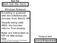 "Bush hid the facts" is a common name for a bug present in Microsoft Windows which causes text encoded in ASCII to be interpreted as if it were UTF-16LE, resulting in garbled text. When the string "Bush hid the facts", without quotes, was put in a new Notepad document and saved, closed, and reopened, the nonsensical sequence of the Chinese characters "畂桳栠摩琠敨映捡獴" would appear instead.