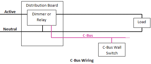 The power control in a C-Bus system lies in a “Dimmer” or “Relay” which is installed in the DB and replaces the traditional switch used in conventional wiring. This Dimmer (or Relay) has a 120/230 V Line interconnection directly to the ceiling light and a neutral connection back from the ceiling light to the Dimmer. The Dimmer will control the light directly and will receive its commands from another device on the C-Bus network (for example, a wall-mounted light switch/keypad). This wall-mounted light switch would not be connected to any load whatsoever; it would be directly connected with the Dimmer with a control/signaling cable. The Dimmers normally come as 4-, 8- or 12-channel DIN-rail mounted devices.
