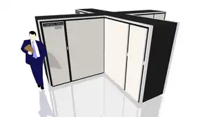 The machine was built in a plus-sign-shaped cabinet with a pump and heat exchanger in the outermost 18 in (46 cm) of each of the four arms. Cooling was done with Freon circulating within the machine and exchanging heat to an external chilled water supply. Each arm could hold four chassis, each about 8 in (20 cm) thick, hinged near the center, and opening a bit like a book. The intersection of the "plus" was filled with cables that interconnected the chassis. The chassis were numbered from 1 (containing all 10 PPUs and their memories, as well as the 12 rather minimal I/O channels) to 16. The main memory for the CPU was spread over many of the chassis. In a system with only 64K words of main memory, one of the arms of the "plus" was omitted.