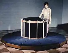 Cray aimed to solve these contradictory problems by doing both; making each module larger and crammed with many more components, while at the same time making the computer as a whole smaller by packing the modules closer together inside the machine. Between the time the 7600 was developed and work on the 8600 began, there had been no process improvements in the components themselves, so any performance improvements had to come solely from packaging.[1] For the new design, they used modules containing eight four-layer circuit boards about 8" by 6", resulting in a stack the size of a large textbook and using up about 3 kilowatts of power. The modules were then packed into a mainframe chassis that was comparatively tiny, a 16-sided cylinder about one meter (3') across and high, sitting on top of a ring of power supplies. The proposed design bears a strong resemblance to the later Cray-2, but even shorter and smaller in diameter.[2]