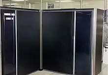 In 1980, the successor to the Cyber 203, the Cyber 205 was announced.[7] The UK Meteorological Office at Bracknell, England was the first customer and they received their Cyber 205 in 1981. The Cyber 205 replaces the STAR vector pipeline with redesigned vector pipelines: both scalar and vector units utilized ECL gate array ICs and are cooled with Freon. Cyber 205 systems were available with two or four vector pipelines, with the four-pipe version theoretically delivering 400 64-bit MFLOPs and 800 32-bit MFLOPs. These speeds are rarely seen in practice other than by handcrafted assembly language. The ECL gate array ICs contain 168 logic gates each,[8] with the clock tree networks being tuned by hand-crafted coax length adjustment. The instruction set would be considered V-CISC (very complex instruction set) among modern processors. Many specialized operations facilitate hardware searches, matrix mathematics, and special instructions that enable decryption.