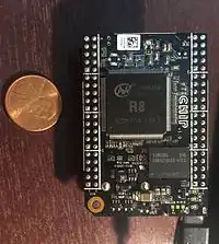 CHIP Pro is similar to the original CHIP board, but uses the newer GR8 version of the chip. It is a system in package (SiP) made by Next Thing Co. It features a 1GHz Allwinner R8 ARMv7 Cortex-A8 processor with NEON SIMD extensions and a Mali-400 GPU. 256MB of Nanya Technology DDR3 SDRAM is combined with the R8 SoC into a 14mm × 14mm, 0.8mm-pitch 252-ball FBGA package, simplifying the routing of connections. Instead of having two dual-line 40-pin sockets as on CHIP, it implements castellated edges where the pin holes are designed and optimized to embed to another board with SMT.[22] Most of the CHIP's hardware features are also included in this model.