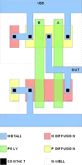 The inputs to the NAND (illustrated in green color) are in polysilicon. The transistors (devices) are formed by the intersection of the polysilicon and diffusion; N diffusion for the N device & P diffusion for the P device (illustrated in salmon and yellow coloring respectively). The output ("out") is connected together in metal (illustrated in cyan coloring). Connections between metal and polysilicon or diffusion are made through contacts (illustrated as black squares). The physical layout example matches the NAND logic circuit given in the previous example.