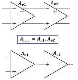 In some applications, like switched capacitor filters or integrators, and different types of analog-to-digital converters, having high gain (70-80 dB) is needed, and achieving the required gain sometimes is impossible with single-stage amplifiers.[6] This is more serious in modern CMOS technologies, which transistors have smaller output resistance due to shorter channel length. To achieve high gain as well as high output swing, multi-stage amplifiers have been invented. To implement two-stage amplifier, one can use FC amplifier as the first stage and a common source amplifier as the second stage. Also, to implement four-stage amplifier, 3 common source amplifier can be cascaded with FC amplifier.[15] It should be mentioned that to drive large capacitive loads or small resistive loads, the output stage should be class AB.[2] For example, common source amplifier with class AB behavior can be used as the final stage in three-stage amplifier to not only improve drive capability, but also gain.[16] Class AB amplifier can be used as a column driver in LCDs.[17]