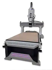 A CNC wood router is a computer-controlled router tool that carves/etches objects or images into the face of a piece of wood.[1] The CNC Router is ideal for hobbies, engineering prototyping, product development, art, and production works. The CNC works on the Cartesian coordinate system (X, Y, Z) for 3D motion control; however, typical CNC operated systems can only make carvings on flat planes. The machine sits on a track and is not capable of making round or spherical cuts. Parts of a project can be designed in the computer with a CAD/CAM program, and then cut automatically using a router or other cutters to produce a finished part. In some instances, the table will not come with a router included. This allows the user to change out routers for different applications. For lighter strained cuts, they could use a lower grade router but for more intensive applications.
