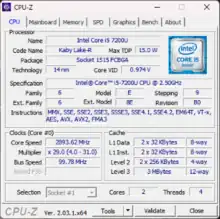 ![]() CPU-Z 2.03.1 under Windows 11, showing information about an Intel Core i5 Kaby Lake 7200U | |