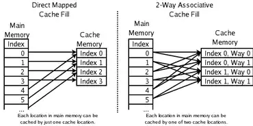 In this cache organization, each location in the main memory can go in only one entry in the cache. Therefore, a direct-mapped cache can also be called a "one-way set associative" cache. It does not have a placement policy as such, since there is no choice of which cache entry's contents to evict. This means that if two locations map to the same entry, they may continually knock each other out. Although simpler, a direct-mapped cache needs to be much larger than an associative one to give comparable performance, and it is more unpredictable. Let x be block number in cache, y be block number of memory, and n be number of blocks in cache, then mapping is done with the help of the equation x = y mod n.