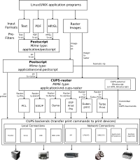 CUPS can convert supplied data either into PostScript data or directly into raster data. If it is converted into PostScript data an additional filter is applied called a prefilter, which runs the PostScript data through another PostScript converter so that it can add printer-specific options like selecting page ranges to print, setting n-up mode and other device-specific things.[33] After the pre-filtering is done, the data can either be sent directly to a CUPS backend if using a PostScript printer, or it can be passed to another filter like Foomatic by linuxprinting.org. Alternatively, it can be passed to Ghostscript, which converts the PostScript into an intermediary CUPS-raster format.[34] The intermediary raster format is then passed onto a final filter which converts the raster data to a printer-specific format. The default filters included with CUPS include: