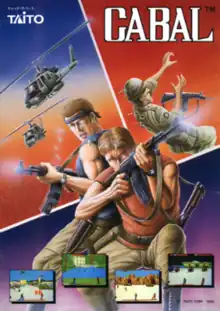 Cabal (カベール, Kabēru) is a 1988 arcade shooter video game originally developed by TAD Corporation and published in Japan by Taito, in North America by Fabtek[5] and in Europe by Capcom.[1] In the game, the player controls a commando, viewed from behind, trying to destroy various enemy military bases.[6] The game was innovative for the era, but only a mild success in the arcades, and became better known for its various home conversions.[5]