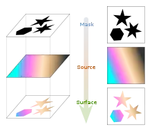 - Then source must be defined, which may be a color, a color gradient, a bitmap or some vector graphics, and from the painted parts of this source a die cut is made with the help of the above defined mask.