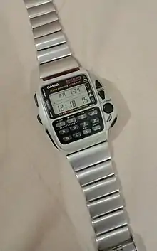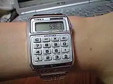 A calculator watch is a digital watch with a built-in calculator, usually including buttons on the watch face. Calculator watches were first introduced in the 1970s and continue to be produced, despite falling from their peak popularity during the 1980s. The most dominant brands were the Casio Databank series and Timex.