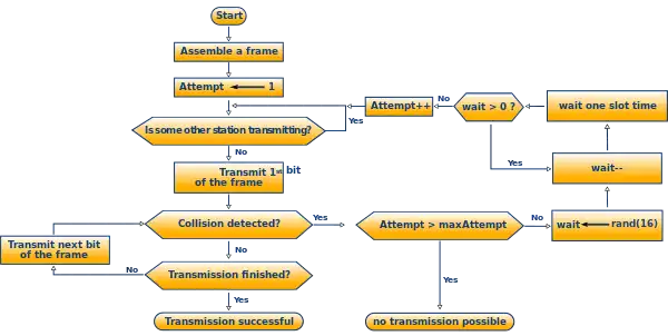 The following procedure is used to initiate a transmission. The procedure is complete when the frame is transmitted successfully or a collision is detected during transmission.[3]: 33