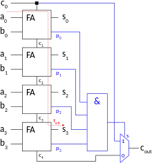 The critical path of a carry-skip-adder begins at the first full-adder, passes through all adders and ends at the sum-bit . Carry-skip-adders are chained (see block-carry-skip-adders) to reduce the overall critical path, since a single -bit carry-skip-adder has no real speed benefit compared to a -bit ripple-carry adder.