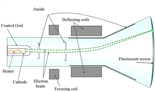 A CRT works by electrically heating a tungsten coil[9] which in turn heats a cathode in the rear of the CRT, causing it to emit electrons which are modulated and focused by electrodes. The electrons are steered by deflection coils or plates, and an anode accelerates them towards the phosphor-coated screen, which generates light when hit by the electrons.[10][11][12]