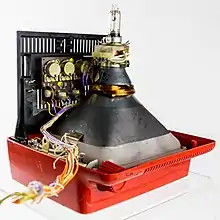 From 1949 to the early 1960s, there was a shift from circular CRTs to rectangular CRTs, although the first rectangular CRTs were made in 1938 by Telefunken.[36][22][37][38][39][40] While circular CRTs were the norm, European TV sets often blocked portions of the screen to make it appear somewhat rectangular while American sets often left the entire front of the CRT exposed or only blocked the upper and lower portions of the CRT.[41][42]
