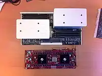 A pair of PCIe card products were launched incorporating the Caustic RT2 ASIC implementation of the RTU. The RT2 was a custom ASIC built on a 90nm TSMC process. The R2100 card had a single RT2 chip and 4GB of onboard DDR2 memory and a claimed peak power consumption of 40 Watts. The R2500 incorporated a pair of RT2 chips and a total of 16GB of memory and had a claimed peak power consumption of 60 Watts. The cards were released for sale in 2013.[25][26]