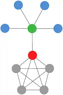 Cross-clique centrality of a single node in a complex graph determines the connectivity of a node to different cliques. A node with high cross-clique connectivity facilitates the propagation of information or disease in a graph. Cliques are subgraphs in which every node is connected to every other node in the clique. The cross-clique connectivity of a node for a given graph with vertices and edges, is defined as where is the number of cliques to which vertex belongs. This measure was used by Faghani in 2013 [34] but was first proposed by Everett and Borgatti in 1998 where they called it clique-overlap centrality.