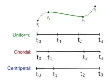 in which ranges from 0 to 1 for knot parameterization, and with . For centripetal Catmull–Rom spline, the value of is . When , the resulting curve is the standard uniform Catmull–Rom spline; when , the result is a chordal Catmull–Rom spline.