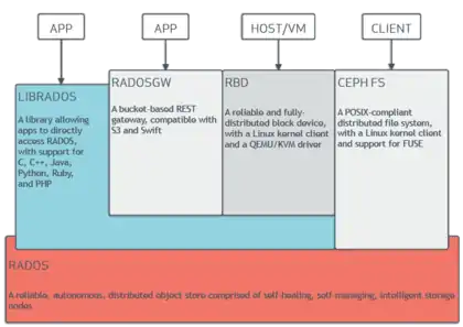 - HTTP gateways (ceph-rgw) that expose the object storage layer as an interface compatible with Amazon S3 or OpenStack Swift APIs