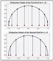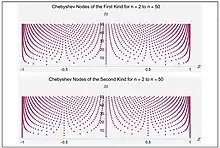 The Chebyshev nodes of the first kind, also called the Chebyshev zeros, are the zeros of the Chebyshev polynomials of the first kind. The Chebyshev nodes of the second kind, also called the Chebyshev extrema, are the extrema of the Chebyshev polynomials of the first kind, which are also the zeros of the Chebyshev polynomials of the second kind. Both of these sets of numbers are commonly referred to as Chebyshev nodes in literature.[1] Polynomial interpolants constructed from these nodes minimize the effect of Runge's phenomenon.[2]