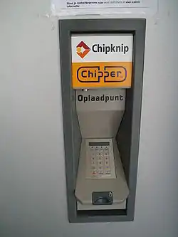 ![]() "Oplaadpunt" (English: Upload point) for the Chipknip and Chipper where money could be deposited onto the card or withdrawn back to the bank account. Chipper was initially an incompatible alternative, but became a differently branded Chipknip after 2001. | |