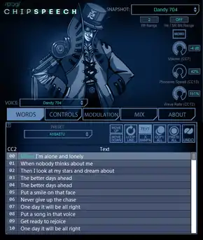 The software is used for creating vocals for use within music. Chipspeech is designed to produce vintage-style vocals from synthesizers that were used by the music industry in the 1980s, having a cut off date of 1989 technology.[4] The vocals, therefore, are not meant to sound realistic and are more suited for sound experimentation. It works as a text-to-speech method. Users type the lyrics in and receive instant playback results which was a capability beyond the original soundchips the software vocals are based on. The software is as simple as Vocaloid. Though English and Japanese come as standard, other languages can be created by direct entry of syllables. Though human-like vocals can be achieved, the results are always machine-like rather than man-like.[5] It is capable of different synthesis methods or re-samplers.[6] In addition for 1.032 version of the software a new "Speak and Spell" program was added creating the circuit bending feature.[7]