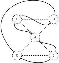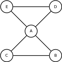 ![]() | Calculate Euler tour Here the tour goes A->B->C->A->D->E->A. Equally valid is A->B->C->A->E->D->A. |