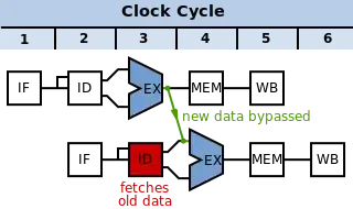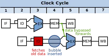 This data hazard can be detected quite easily when the program's machine code is written by the compiler. The Stanford MIPS machine relied on the compiler to add the NOP instructions in this case, rather than having the circuitry to detect and (more taxingly) stall the first two pipeline stages. Hence the name MIPS: Microprocessor without Interlocked Pipeline Stages. It turned out that the extra NOP instructions added by the compiler expanded the program binaries enough that the instruction cache hit rate was reduced. The stall hardware, although expensive, was put back into later designs to improve instruction cache hit rate, at which point the acronym no longer made sense.