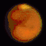 | Mars, as seen through a small telescope in 2003, showing the patterns of brightness and color known as albedo features. | |