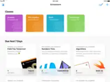 Schoolwork is a companion app for Classroom, announced during Apple's edtech event in March 2018 and released in June 2018.[3][4][5] The free app allows teachers to distribute documents, iBook files, web links, and assignments through ClassKit (such as Kahoot! quizzes) with due dates.[6][7] Students can hand-in those assignments via the app for teachers to view and provide feedback via the app.[8]