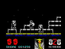In the ZX Spectrum version, boxing gloves located at the bottom of the screen indicate the number of lives the player has, while a duck symbol gradually depletes as the player's weapon wears out.[7][8] In the Commodore 64 version, snake heads are used to indicate the number of lives, and a hamburger icon represents the player's amount of energy.[5][9][10]