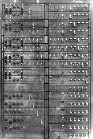 ![]() A Colossus Mark 2 computer being operated by Wrens.[lower-alpha 1] The slanted control panel on the left was used to set the "pin" (or "cam") patterns of the Lorenz. The "bedstead" paper tape transport is on the right. | |