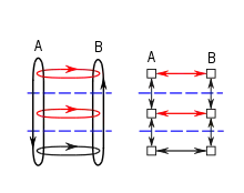 Computations deal with algorithms and data; Communication involves protocols and messages; So the analog of a data flow diagram is some kind of message flow diagram.[4] To visualize protocol layering and protocol suites, a diagram of the message flows in and between two systems, A and B, is shown in figure 3. The systems, A and B, both make use of the same protocol suite. The vertical flows (and protocols) are in-system and the horizontal message flows (and protocols) are between systems. The message flows are governed by rules, and data formats specified by protocols. The blue lines mark the boundaries of the (horizontal) protocol layers.