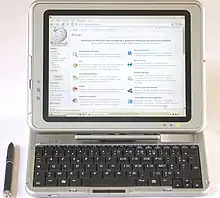 The TC1000 is a 10.4" laplet designed by Compaq, before it was purchased by HP. It used the Transmeta Crusoe processor. Unlike many other tablet PCs of its time (which can only operate either in a traditional laptop configuration, or with the keyboard folded behind the screen), the display is fully detachable from the keyboard. The product was developed and manufactured using ODM model from LG Electronics, Inc. of South Korea.