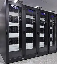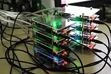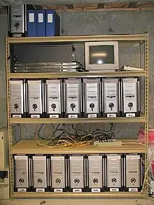 A computer cluster may be a simple two-node system which just connects two personal computers, or may be a very fast supercomputer. A basic approach to building a cluster is that of a Beowulf cluster which may be built with a few personal computers to produce a cost-effective alternative to traditional high-performance computing. An early project that showed the viability of the concept was the 133-node Stone Soupercomputer.[7] The developers used Linux, the Parallel Virtual Machine toolkit and the Message Passing Interface library to achieve high performance at a relatively low cost.[8]