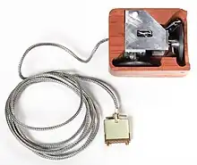 Several other experimental pointing-devices developed for Engelbart's oN-Line System (NLS) exploited different body movements – for example, head-mounted devices attached to the chin or nose – but ultimately the mouse won out because of its speed and convenience.[30] The first mouse, a bulky device (pictured) used two potentiometers perpendicular to each other and connected to wheels: the rotation of each wheel translated into motion along one axis.[31] At the time of the "Mother of All Demos", Engelbart's group had been using their second-generation, 3-button mouse for about a year.