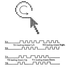 The counters needed for X and Y simply count through four states, in either direction (up or down), changing only one bit at a time (i.e. 00, 01, 11, 10). This is a simple case of either a Gray-code counter or a Johnson counter (Moebius counter).