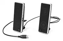 Computer speakers, or multimedia speakers, are speakers sold for use with computers, although usually capable of other audio uses, e.g. for an MP3 player. Most such speakers have an internal amplifier and consequently require a power source, which may be by a mains power supply often via an AC adapter, batteries, or a USB port. The signal input connector is often a 3.5 mm jack plug (usually color-coded lime green per the PC 99 standard); RCA connectors are sometimes used, and a USB port may supply both signal and power (requiring additional circuitry, and only suitable for use with a computer). Battery-powered wireless Bluetooth speakers require no connections at all. Most computers have speakers of low power and quality built in; when external speakers are connected they disable the built-in speakers. Altec Lansing claims to have created the computer speaker market in 1990.[1]