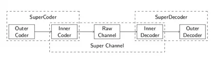 The inner code Cin takes one of |A|k = |B| possible inputs, encodes into an n-tuple over A, transmits, and decodes into one of |B| possible outputs. We regard this as a (super) channel which can transmit one symbol from the alphabet B. We use this channel N times to transmit each of the N symbols in a codeword of Cout. The concatenation of Cout (as outer code) with Cin (as inner code), denoted Cout∘Cin, is thus a code of length Nn over the alphabet A:[1]