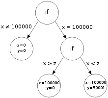 We begin with an arbitrary choice for x and y, for example x = y = 1. In the concrete execution, line 2 sets z to 2, and the test in line 3 fails since 1 ≠ 100000. Concurrently, the symbolic execution follows the same path but treats x and y as symbolic variables. It sets z to the expression 2y and notes that, because the test in line 3 failed, x ≠ 100000. This inequality is called a path condition and must be true for all executions following the same execution path as the current one.