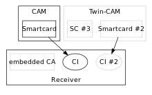 A conditional access module (CAM) is an electronic device, usually incorporating a slot for a smart card, which equips an integrated digital television or set-top box with the appropriate hardware facility to view conditional access content that has been encrypted using a conditional access system.[1] They are normally used with direct-broadcast satellite (DBS) services, although digital terrestrial pay TV suppliers also use CAMs. PC Card form factor is used as the Common Interface form of Conditional Access Modules for DVB broadcasts. Major CAM manufacturers include: Neotion, SmarDTV and SMIT.