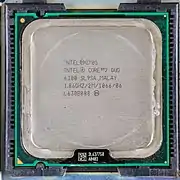 Conroe is the code name for many Intel processors sold as Core 2 Duo, Xeon, Pentium Dual-Core and Celeron. It was the first desktop processor to be based on the Core microarchitecture, replacing the NetBurst microarchitecture based Cedar Mill processor. It has product code 80557, which is shared with Allendale and Conroe-L that are very similar but have a smaller L2 cache. Conroe-L has only one processor core and a new CPUID model. The mobile version of Conroe is Merom, the dual-socket server version is Woodcrest, the quad-core desktop version is Kentsfield and the quad-core dual-socket version is Clovertown. Conroe was replaced by the 45 nm Wolfdale processor.