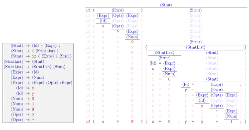 The first rule allows the S symbol to multiply; the second rule allows the S symbol to become enclosed by matching parentheses; and the third rule terminates the recursion.[9]