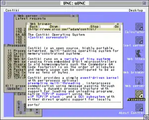 Contiki supports per-process optional preemptive multithreading, inter-process communication using message passing through events, as well as an optional graphical user interface (GUI) subsystem with either direct graphic support for locally connected terminals or networked virtual display with Virtual Network Computing (VNC) or over Telnet.
