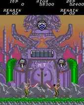 The player loses a life if their character (Bill or Lance) comes into contact with enemies or their missiles, fails to complete a base stage before the time limit, or falls into a bottomless pit. When that happens, the character will revert to his default weapon on his next life. After losing all lives, the player can continue by inserting more coins (if necessary) and pressing Start, but only up to three times. A second player can join in anytime, but if one player loses all of their lives, they must wait until the other player loses their lives as well to continue together.