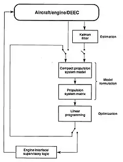 The figure presents an example of a performance-seeking control-flow diagram of the algorithm. The control law consists of estimation, modeling, and optimization processes. In the Kalman filter estimator, the inputs, outputs, and residuals were recorded. At the compact propulsion-system-modeling stage, all the estimated inlet and engine parameters were recorded.[1]