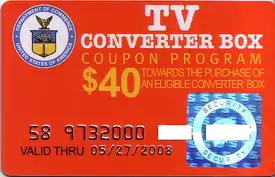 An example of the NTIA converter box $40 subsidy "coupon", which is in the form of a bank card that can only be used as payment for a converter box purchase.