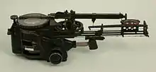 On early models, rotating the compass face also rotated a shaft that ran forward under the main body of the bombsight and through a metal tube running out the lower front of the main housing. On later models, a large knob known as the milled head was placed directly behind the compass and drove this shaft independently of the compass face, allowing calculations to be carried out without changing the bombsight settings.[25] The rotating shaft ran to the wind bar located in front of the body of the gunsight. The rotation of this bar to the selected angle mechanically represented the wind vector relative to the aircraft.[26] At the end of the wind bar is the wind screw knob, which is used to set the wind speed. As the knob is rotated, a plate inside the wind bar moves fore and aft along the direction of the bar.[26]