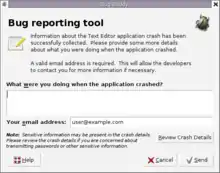 Bug Buddy is the crash reporting tool used by the GNOME platform. When an application using the GNOME libraries crashes, Bug Buddy generates a stack trace using gdb and invites the user to submit the report to the GNOME bugzilla. The user can add comments and view the details of the crash report.